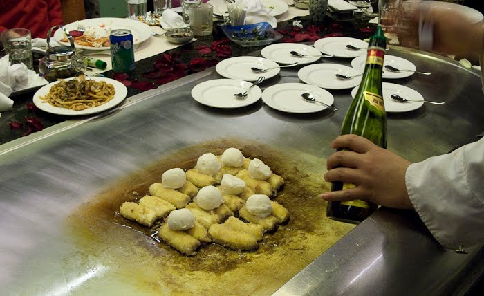 25. Bananas Flambé – coated in shredded coconut, grilled, and set on fire with brandy while the lights were out in the room. Topped with a little scoop of vanilla ice cream and certainly worth skipping the fungus course.