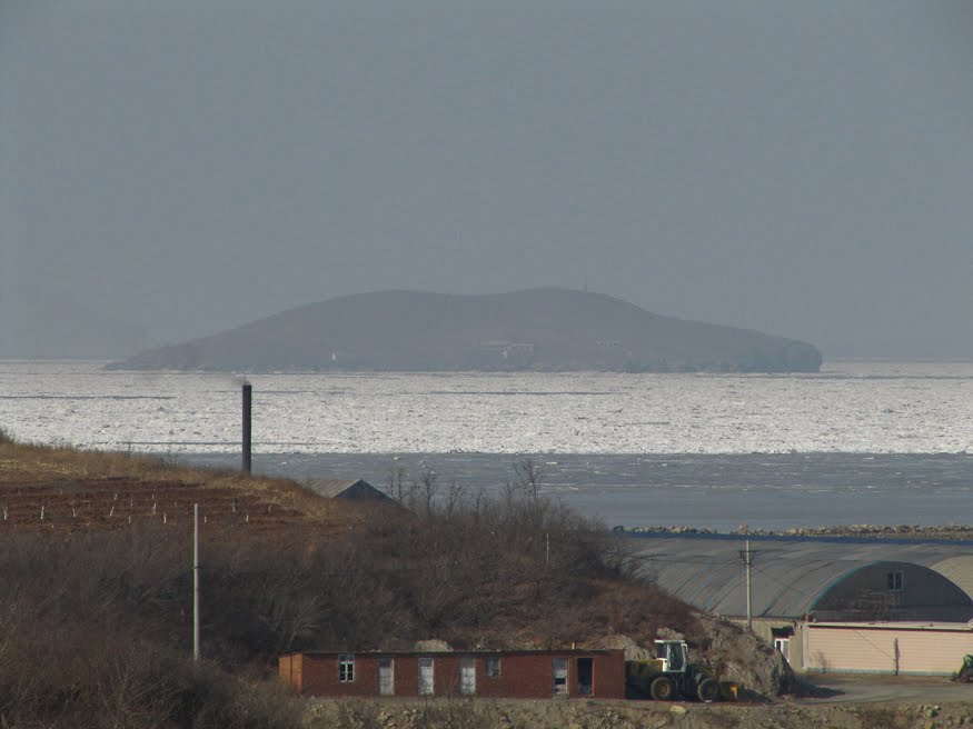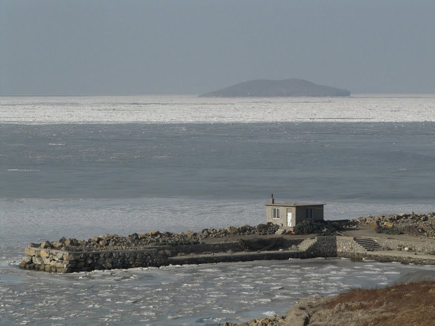 From Qiaomaishan to the sea was no more than a mile and rounding the corner we were faced with an endless expanse of frozen sea – glassy smooth in the bays and choppy and white out where the waves have a stronger effect. Down by the shore, Chinese palapas stood abandoned on the rocky shore, side by side with the wooden fishing boats pulled up for the season. We rode up the coast on a brand new and completely abandoned road stopping here and there to take photos. Far off in the distance, a small island stood completely ringed in white. At the end of a dirt track we found the most perfect view – frozen aquaculture impoundments up front, a small patch of green-blue open water in a cove and ice all the way to the horizon. Two big dogs stood in a cage at a corner of a jetty guarding who knows what. The scene was precisely what had been in the newspaper – the sea was no longer the sea.
