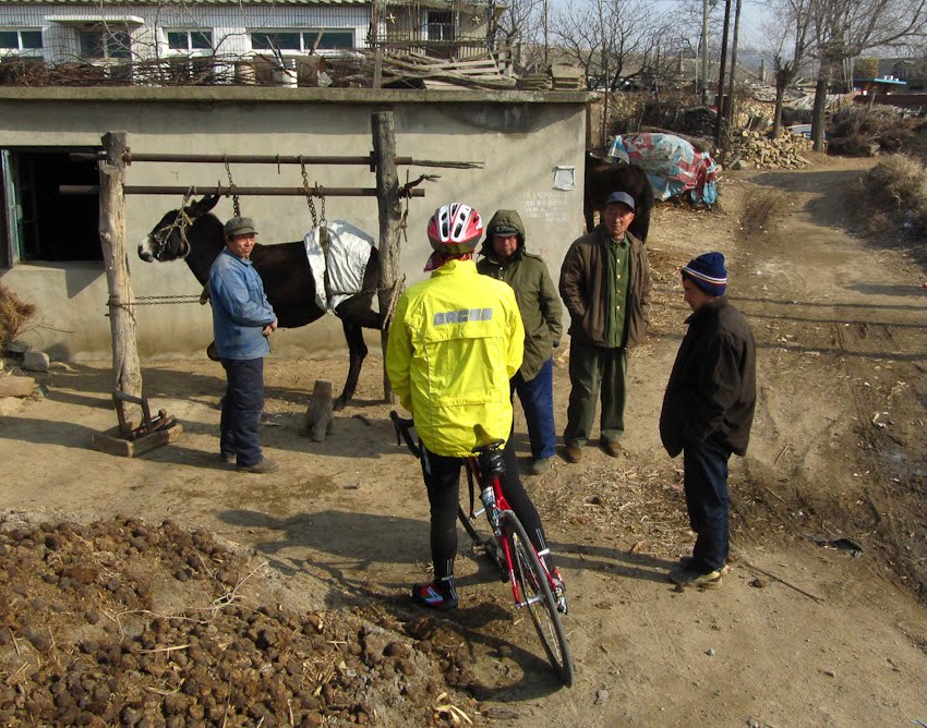 It has been very cold here recently and the extremities of weather make cycling a rather hard undertaking. While my riding partner Dermot and I have not had to endure days like the one we spent in the monsoon last summer, we have had to deal with the cold and the wind, the two things that make Dalian what it is in the wintertime. But with those challenging meteorological moments comes many rewards. Seeing village life in January’s China is fascinating – women doing laundry in square holes chopped in the ice or in whatever open water there is, donkeys sporting little red tassels on their halters tied up in warm little nooks out of the wind and dozing in the sunshine, cows lying by the side of the road doing the same, people up on their roof milling the corn they put up there last fall, old men trying to find one last little bit of firewood by trimming the unimportant branches in their cherry orchards. Life here in the winter is about keeping warm, staying fed and making sure that the animals make it through to spring when their work begins.