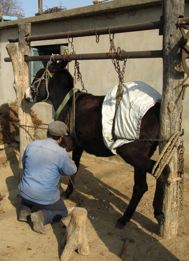 We have a route that cuts straight across to the other side. In some places it’s beautiful – shady stretches lined with Plane Trees, their trunks painted white halfway up creating the illusion that you’re somewhere in the middle of rural France. In others the typical grimy side street so common here. Once past the economic corridor that runs down the center though, it’s all about peach orchards, dusty villages and eventually, fishing. Up and over the first climb, we passed a group of men watching their donkey gets shoed. We rode past but I stopped and decided that this was an opportunity not to be missed. We turned around, went back and made our introductions. I asked politely if I could take some photographs explaining that my wife back in America had many horses and would find pictures very enjoyable. Of course there was no problem – Chinese people are always willing to visit with a couple of guys dressed as though they’d just stepped off of a spaceship. The farrier smiled and posed as he went about his work. The donkey, chained up and hanging in the air from a wooden beam didn’t seem to be as willing to participate in our visit. Every minute or so he’d try to kick with his bound hind leg and this got a reaction from the men who admired his spirit but laughed at the futility. Whenever we stop to talk to people our bicycles are the center of attraction. The men pick them up and comment on their lightness. They squeeze the tires and insist that all of their friends do the same. They smile and look at each other with childish grins, genuinely amazed at what we call a bike, ours being so much different than what they’re used to. One man here was impressed with the water bottle, another with the saddle. They passed my bike around, lifting it up to their shoulders before handing it to the next guy down the line. Conversations are difficult here though as the rural dialect is tough to understand. They get us, but we don’t get them. Jiang, my driver, told me that they speak “Jinzhou farmer Chinese” and even though we’re no more than 10 miles out of Dalian, it’s impossible to understand them. It doesn’t matter though because the gist of what’s going on is good enough for everyone present. Every time I make one of these stops, I go away glad that I did.