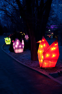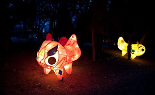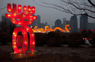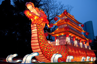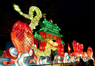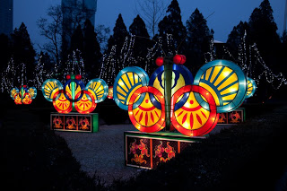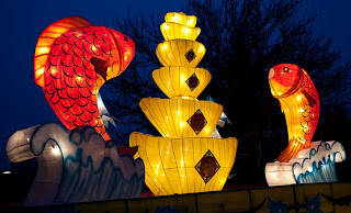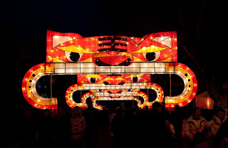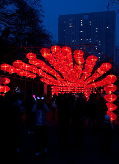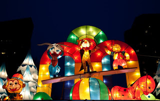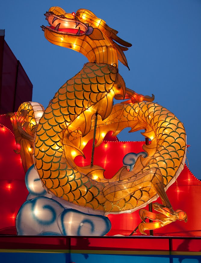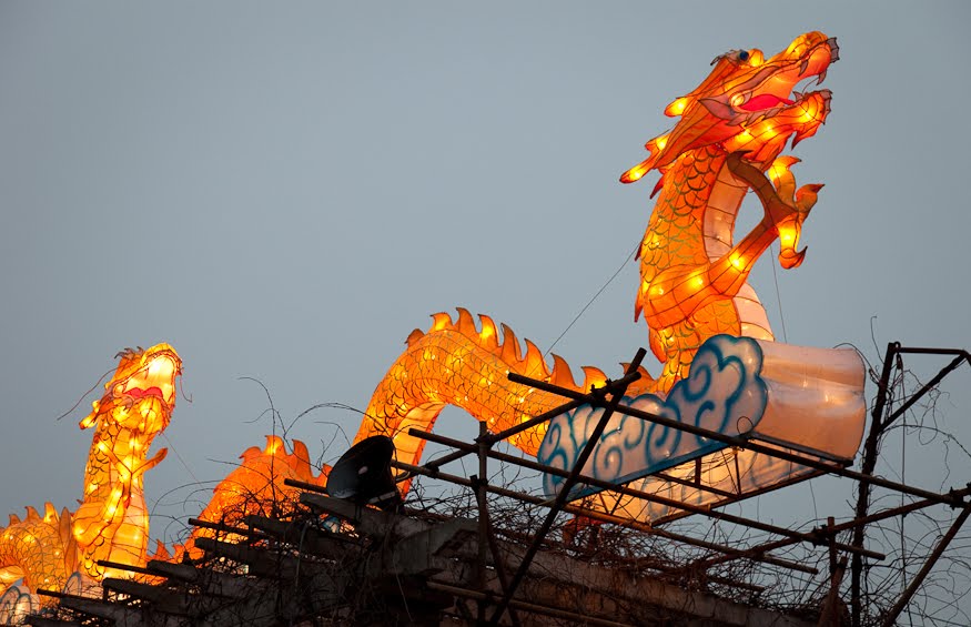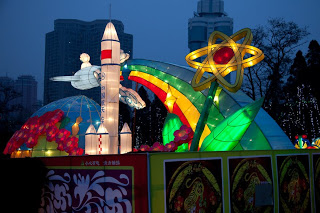 Running up the center of Labor Park is a long flight of stairs that climbs a hill to a giant red and white soccer ball that also happens to be the door to an underground disco. Lining the stairs is a series of bronze statues depicting the 12 animals that form the zodiac, each of them having a bright golden spot or two showing through their natural brown patina from the Chinese rubbing them for good luck. I always wink at the horse when I walk by. Behind the animals were floats with dragons, drummers, Beijing Opera masks and even one depicting the Chinese space program. At the top, the path was flanked by two sinuous golden dragons framing a giant blue and white inflatable Ming dynasty vase. Off to the side were green Saguaro cacti, toadstools and some tall, stalky mushrooms, one of which was suffering from erectile dysfunction. Here and there were little green, pink and yellow cartoon tigers, waiting to pounce. Down the hill someone was tolling the big bronze bell which gave the place a bit of a mystical, ponderous bent until suddenly, at 5:30 PM, the lights came on. And everything changed.