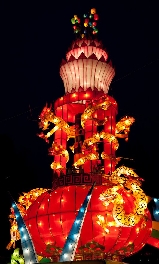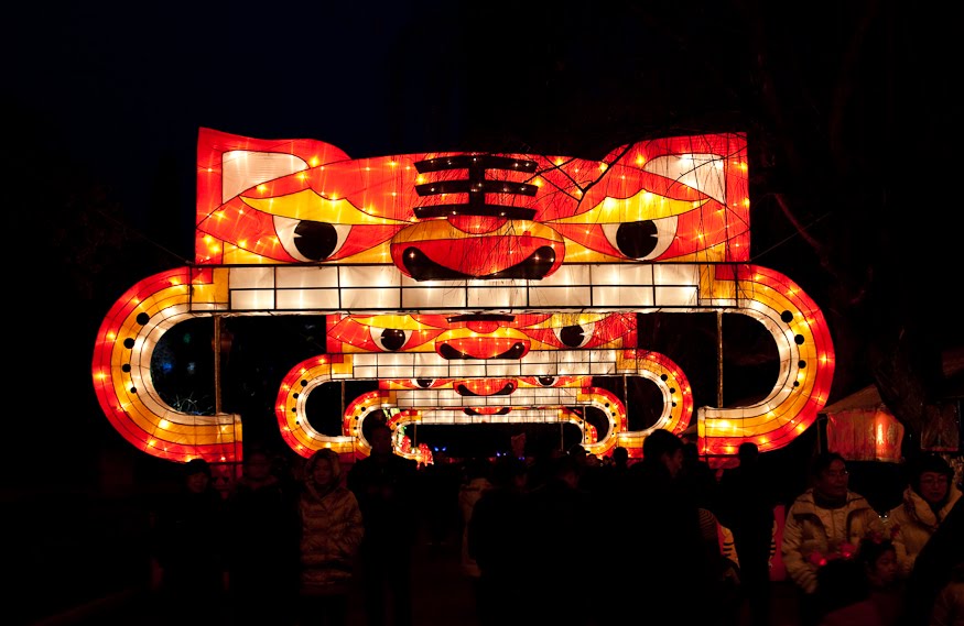 I was here last year and pretty much knew what to expect. The park is decorated with all kinds of what I would label “immoveable floats” depicting Chinese themes constructed out of brightly colored fabrics. The overall theme is whatever annual zodiac animal it happens to be, and this year it’s the Year of the Tiger. I wandered around photographing this and that and not really getting a good vibe from the place because the weather was just so gray. It was crowded but not so much so that it was hard to get around. It was impossible though to photograph anything without a couple of young people standing in my way while flashing a “V” sign for whoever was taking their picture. I went down an avenue crowned with a series of tiger faces, the road forming a giant asphalt tongue, and took a left through the one place that was the same as last year – the tunnel of round red lanterns. I like this spot – the flow of it is quite beautiful and very cheery and would be a great place to stop and just soak in if you happened to be in a bad mood. No unhappy person can make it from one end of the tunnel to the other without cracking a smile and finding themselves thankful for something.