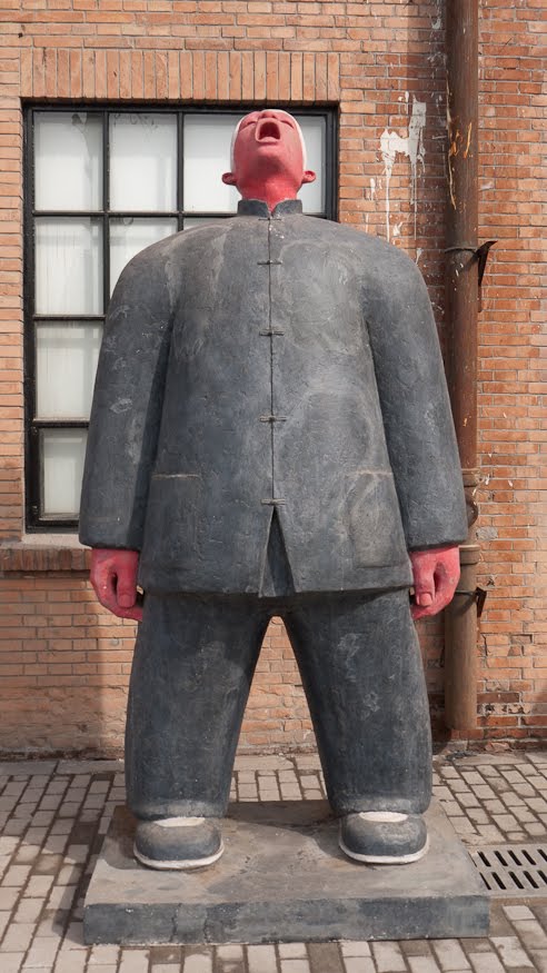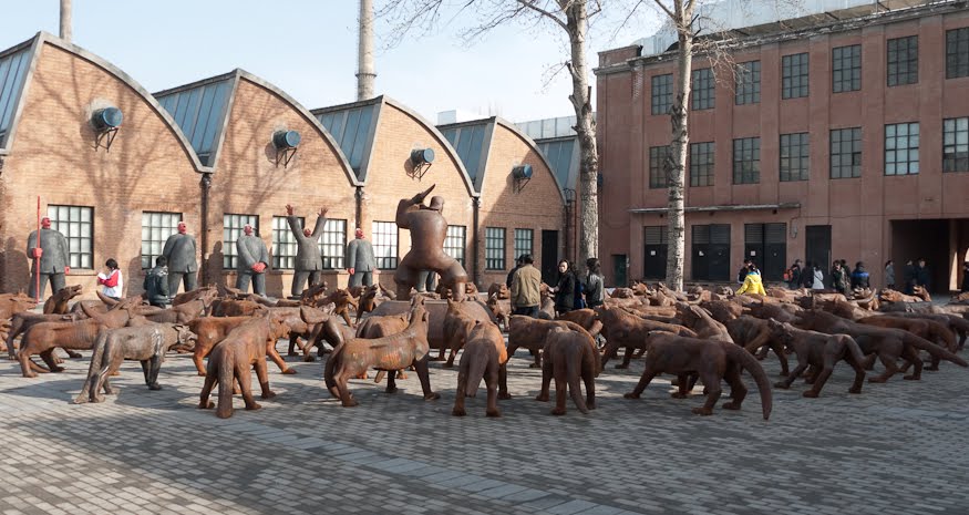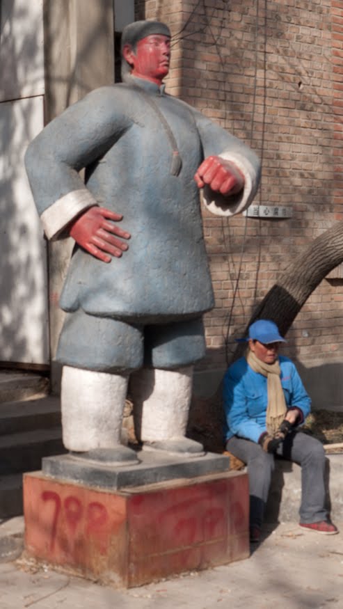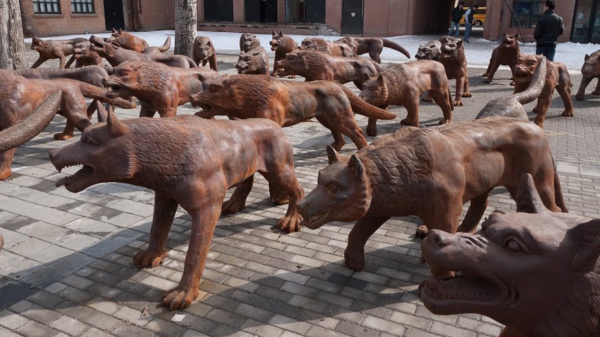 For the afternoon entertainment we visited the 798 Art District. I’d been there back in January on a day far too cold to spend too much time wandering around. Today was milder and so we took our time perusing a few galleries and the outside art including an amazing steel sculpture consisting of dozens of life-size wolves circling a lone warrior brandishing a sword. We stopped for coffee and sat at a picnic table watching a young couple having their wedding pictures taken. It’s always funny to see these young women in the expensive dresses peel off their down jackets and their bare shoulders exposed to the winter wind, get their picture taken just before they freeze. Done, they hoist up their layers of silk, satin and lace exposing a pair of jeans and running shoes before ducking into the waiting car. On my last time here I’d seen a small shop selling curios labeled with “Mao-Bama” and “Oba-Mao” which I thought was pretty funny. Our president dressed in Mao’s clothing. We stopped to buy a t-shirt and I got chatting with the young woman owner. She asked me if my kid was my kid and I said “yes”. She started giggling and told me in Chinese that I was far too young to be her dad.
