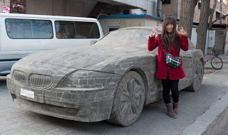 While walking out we saw a group of young women taking turns having their picture taken in front of a cement BMW sculpture. I asked the last girl to pose for me and she was beyond happy to do so, shooting me two “V” signs as I took the shot.