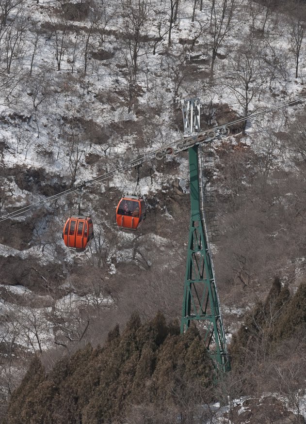 You have two options to get to the top here, walk up or ride up. Given the snow and our lack of insight into the quality of the trails, we decided to ride one way and deal with the descent later. The path here between the long parallel lines of souvenir stalls was steep, cobbled and slippery due to the snow melt making me think that we’d made the right choice. We trudged up to the cable car hut and waited in line with a large group of American families also here on school break. As our car rounded the bottom capstan we were glad to see that it had been blessed by the 9th Living Buddha who had ridden it in 1999. Double blessed I guess, considering all the “9’s” involved in that transaction. We rode up with a two couples from Connecticut, chaperones for the horde of teenagers. I scanned the brochure and caught a picture of a young Bill Clinton in an raspberry polo shirt mounting one of the bright orange cars.