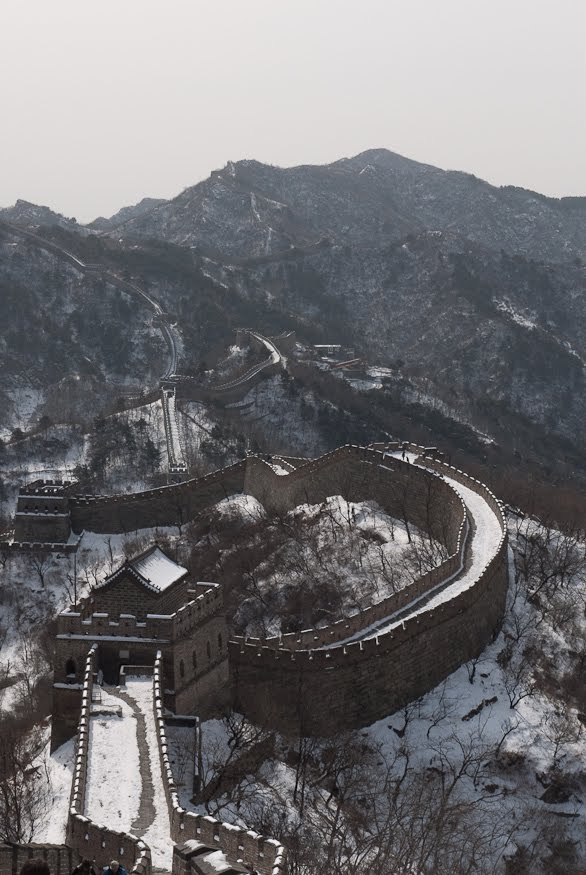 I had asked a friend at work to hire a car to take us to the Great Wall as our first stop. So many things are done this way here – you meet someone who had a Chinese teacher who happens to have a friend who owns a travel agency in some place you want to go. This is “guanxi”, the Chinese way of getting things done. And so this friend of a friend who now happens to work at my place called her pal and made sure that there was a car waiting for us at 9:30 AM. We made our introductions and headed out into the Beijing rush hour traffic. There are three well known Wall locations close to Beijing and I had decided on Mutinayu due to its reputation as being pretty well preserved and not terribly loaded with tourists. It’s not as close as the most famous site at Badaling, but you are rewarded with smaller crowds and less pushy souvenir sellers at the small cost of sitting in the car for an extra 30 minutes. We left the city on the airport expressway and drove towards the mountains on the horizon. The day was typically hazy due both to the notorious Beijing air and the melting snow that still blanketed the fields ringing the city.