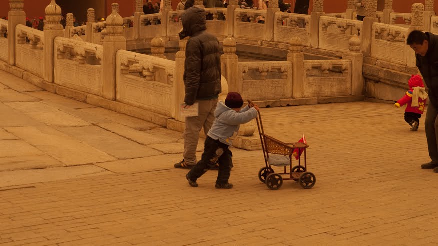 At breakfast it was obvious that the weather had gone somewhere south of south. You could barely see across the street and the giant CCTV pretzel building (and its burned out companion, a victim of careless fireworks use) two blocks down the street was gone. We ate and went downstairs (once we were able to get an elevator due to overuse by the Chinese representatives of Cameroon, Zambia, Slovakia and their kin) and walked out into a world lit by light and of a color I’d never seen in my life. Everything had a pale yellow cast, even the shadows, such as they were. The wind was strong and the air smelled of dirt.