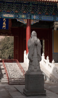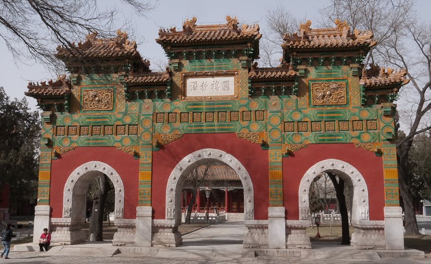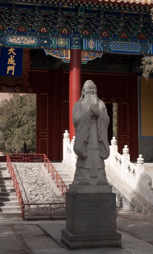 After the weather and the general official nature of the Tiananmen area, this place was an Eden. The temple itself, built by a prince during the Ming dynasty was beautiful – fantastically decorated and beautifully restored. We wandered through a nice display of artifacts and stopped for a long time to marvel at a 59 foot tall Buddha, carved from a single Sandalwood tree. He was so tall that the temple barely held him; his head far up into the rafters. A monk in burgundy stood near the base tossing long strands of white silk into gaps in the carvings at the base, some sort of ritual. We spent a lot of time here recovering from the earlier part of the day before heading out in search of the Confucian Temple which I pretended to know the whereabouts of. Luckily for me it was straight down the street I picked, demonstrating once again to my child, my unerring sense of direction and place.