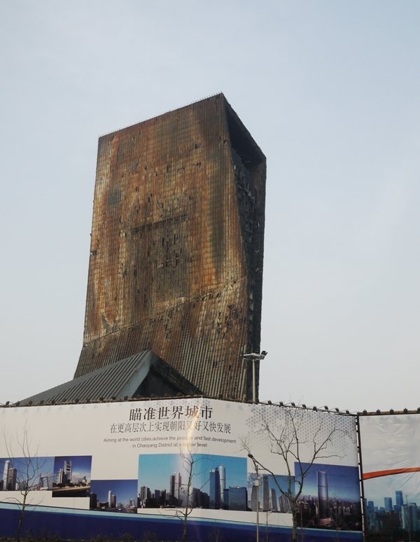 It was quite a scandal at the time because CCTV didn’t cover the fire which of course it should have being the country’s news television monopoly. It stood there burning with no official word until someone finally pointed out that it might be consistent with good news reporting practice to provide live coverage of the biggest story of the moment. The building is now not considered to be a complete loss – they claim that only the exterior is damaged. But I don’t know, it looks pretty wrecked to me standing there all rusty and charred. They hastily erected a tall barrier around it to hide the problem and until just this week it was nothing more than a bunch of rusty steel sheets. As of today those sheets are covered with cheery skins depicting a bright and sunny future for the sight.