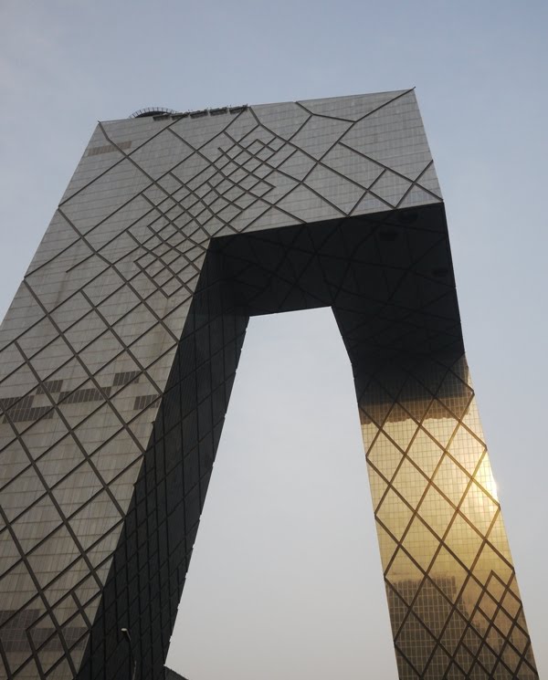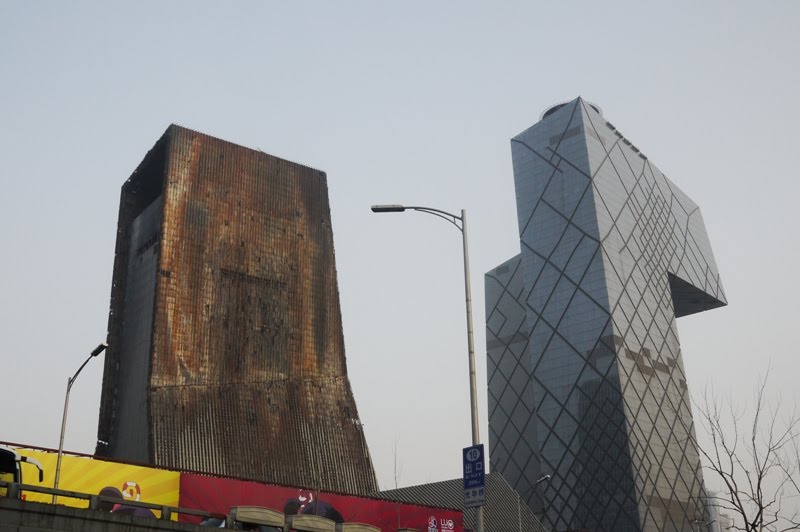 On my very first real visit to Beijing I stayed at a hotel just around the block from the relatively world famous CCTV building. Whether or not you know it by name, I’m sure you know it by sight – a giant steel and blue glass pretzel that defies an explanation as to what holds it up. The first time I saw it, it was on a cold clear northern China morning and the sight of it standing out against the bright blue sky was quite breathtaking. The Dutch architect Rem Koolhaus did an amazing job designing and building it and it has become an iconic part of the Beijing skyline. It serves as the headquarters for China Central Television and was completed (exterior only) in July 2008. An accompanying television production center and hotel/entertainment building stands next door; a very plain and common design which I happen to think diminishes its glitzy neighbor. No worries because on February 9th 2009, the final day of Spring Festival and my favorite day of the year, Lantern Festival, the production center was set ablaze by guess what, fireworks. They were being set off from the top of the CCTV tower, and they ignited the skin of the building next door. A fireman lost his life fighting the blaze and the whole thing was a giant embarrassment for a local government that is touchy on a good day.