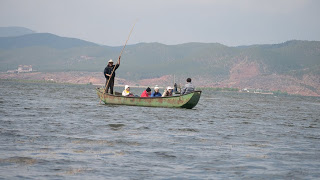 The lake was huge and windswept and notable for its lack of waterfowl. There were perhaps a few dozen Coots and ducks here and there but nothing on the order of what I had hoped to see. We headed off to the south with the wind to our right, small waves lapped against the steel sides of the boat and sent some spray up and over the bow. A long line of partially submerged trees got me wondering how they could survive standing in this water. To our left, a Chinese couple in their very own boat provided an entertaining photo op.