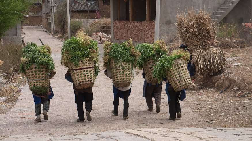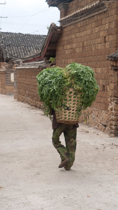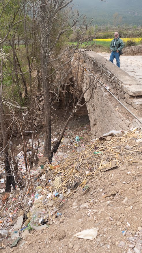 Dayan in Lijiang is a polished retail gem. Shu He is just a bit less refined and Bai Shi is the most rustic of the three. Here, the balance between pastoral lifestyle and commerce strongly tips to the former. The buildings were clearly ancient and un-restored and people were going about their daily chores in spite of our presence. There were perhaps no more than 20 tourists in the entire village. Entering the town I passed a little old woman with a giant basket of Cilantro on her back. Walking out to the edge of town we passed another group of four women bringing the days harvest back to their homes. We crossed an ancient stone bridge and looked at the fields which extended from the village to the foothills off in the west. A big hawk sitting in a tree tolerated our presence for a few minutes before launching itself and wheeling off into the wind. I wanted a shot of the side of the bridge because it was one of those classical stone jobs supported by a semicircular arch. I stepped off the road in order to get a better angle and in doing so discovered the town dump – bring your trash to the old bridge and toss it off. Another arroyo put to good use.