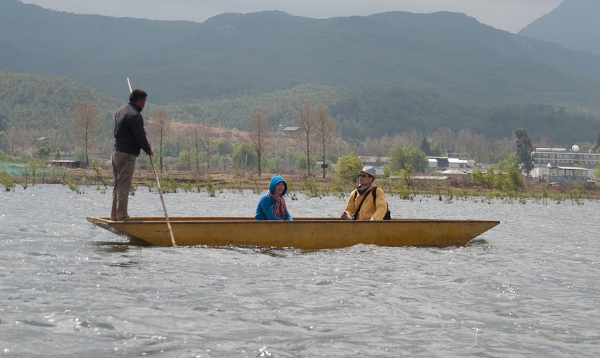 Pony rides seemed to be the big draw here judging from the number of stocky little horses that stood in the fields chewing on marsh grass. A couple of groups of Chinese tourists came trotting by. One of the handlers accompanying them gave a big slap on the butt of one of the tourist ponies and it took off fast, its rider holding on for dear life. We walked on towards the lake until the path ended at a hut made of wooden poles and plastic tarps. A man and a woman sat inside cooking over a small fire. I asked “where” and he grunted and pointed to the left. Down at the end of another small levee a couple of guys stood poles in hand. Judging from their body language they clearly hoped that we were not coming to see them. When they saw we were, the quicker of the two grabbed a boat and took off, leaving his friend to deal with us.