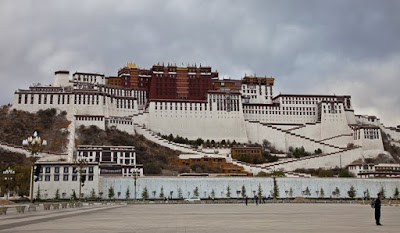 The Buddhist influence was immediately obvious with shrines along the road and prayer flags decorating almost all of the willow trees lining the irrigation ditches. The top of every building had a stripped tree branch with flags, looking like a television antenna decorated for some festive holiday. Farmers were working the fields. The city kind of came out of nowhere, I found myself on a broad boulevard with the most unusual and ornate streetlights – like giant tulips fashioned out of yellow steel with white flowers. We drove into rush hour traffic and I was instantly struck by two things – not many cars and no tall buildings. Looking at it, you’d say you were in some small provincial town, not the capital of the province. While grimy on this, the Chinese of town, overall you did not get that same oppressive feeling you get from every other Chinese city. Crowning the feeling was the sky – blue with puffy white clouds. As we got into the heart of town and on the way to my hotel, I kept glancing up every street to my left until I caught a glimpse of what I had come so far and struggled to see – the palace of the Dalai Lama, the Potala. I knew I was here.