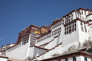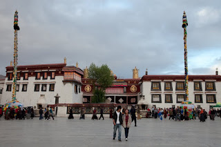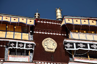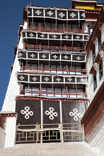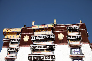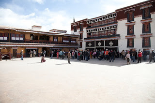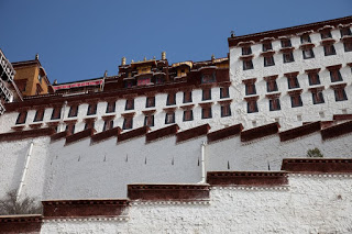 No pictures are allowed inside, so I had to plan to leave with only my memories. The Red Palace has served as the quarters of the Dalai Lama from the earliest days of this building. The tour route wound a confusing serpentine from room to room, sometimes crossing where we’d been and other times forming a series of concentric circles. We walked through the private rooms where the Dalai Lama had lived and met with visiting dignitaries and through broad, dimly lit assembly rooms where the learned would debate the nuances of their beliefs. In one room two incredibly ornate and detailed giant gold mandalas stood behind wooden screens, depicting the notion of eternal recurrence and the wheel of life. All along the way worshipers were spooning Yak butter into fonts that held small burning candles, offerings to the various Buddha in the room. It was all very moving and quite different than anything I had seen in any of the other temples I’d visited across the country. The colors reminded me a lot of Mexico and Central America – bright ochre walls trimmed in vivid red and turquoise. Tse Tan kept his patter up but each time we stopped a security guard would move us along.