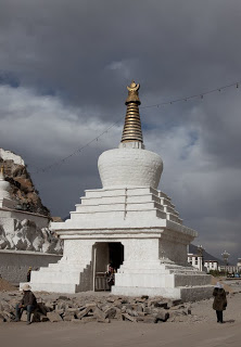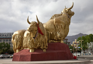 I had a couple of additional objectives for the day, some small temples by the Potala and some rock carvings on the far side of a small hill that flanks the river on the other side of town. I took off from the Barkhor and headed back the way I had come earlier, arriving at the place where my guidebooks said the first temple would be. And here we shall listen to my rant about guidebooks in general. Starting back in September of last year when My Lovely Wife and I visited the Emerald Isle, it slowly became apparent that travel guidebooks are at best incorrect and an worst full of downright lies. We stayed in some funky hotels on that trip, ill-described in terms of their location and completely wrong in the description of their quality. But you write that off and go on – overlooking the miss in order not to detract from the fun you’re having on the trip. This time though with an ice pick headache and little air to breathe I gave into the rank hatred of the guidebook’s authors as I found myself on the other side of town faced with an “atmospheric temple that’s a must see” that simply wasn’t there. Failing at that I went on for another mile or two towards the “small rough track that runs parallel to a small stream that leads to the ancient rock carvings on the side of the hill.” That romantic description was nothing like the paved entrance to a factory that more or less fit the location by the stream. Things change I guess and places move on while the books are awaiting their next update. Given the cycle and how long it takes, I suspect that it would be better to simply offer descriptions and directions to things that don’t move – like mountains and oceans. The hike was not a complete washout – I was able to pay a visit to the golden statue celebrating the critical role of the Yak in this region’s culture and economy.