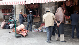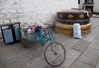 Like all the great cathedrals one leaves a place like this for the better, moved in many small and unexplainable ways. You feel good and you feel connected. We went back out into the sunshine and said “goodbye” having made our plans for the next day. I was close to the hotel so I went back and grabbed another handful of aspirin, unburdening myself from some of the things I had picked up over the course of the day. Leaving I took a different route back to the ancient town passing through the Muslim quarter, stopping to look at the outdoor butcher shops and the roof of the bright green mosque secure behind a tall white-plastered wall. I fell back into the flow of the pilgrims near the Jokhang and walked slowly looking at the goods in the stalls. Prayer wheels, Buddha, long Tibetan temple horns, running shoes and t-shirts – everything you could imagine.