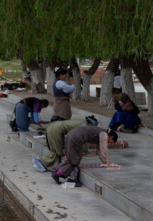 The line of pilgrims here extended for many yards out the front door, but the Tibetan Guide Mafia came into play once again. Tse Tan ran into yet another colleague who handed him a partially used ticket which he have to me. A “souvenir” as he called it. The crowd he explained was unusually large today as this was the weekend preceding the entrance exams to the better Chinese secondary schools and so there were a lot of students and parents here to pray for good results. We cut to the inside of the line and went into the main atrium, Yak hair sunshades blowing in the breeze and golden roofs decorated the surrounding buildings. In entering we passed many women and children praying in a side yard, standing, kneeling, lying prostrate and repeating the process in a seemingly endless cycle.