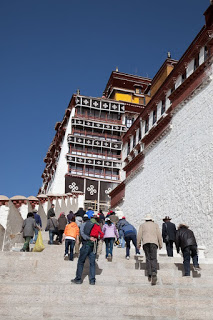 Our first stop today was the Potala for a tour. We drove the few blocks through light morning traffic passing countless pilgrims already up and making their circumambulations of the city. I asked where they came from and the answer was “all over the region.” The numbers ebb and flow depending on the weather and the Buddhist calendar, but in general there are always hundreds of them in the street. Most were elderly – this type of worship seems to be the province of people who no longer have to work. As we drove by, they walked on and on chatting among themselves and continuously spinning their prayer wheels.