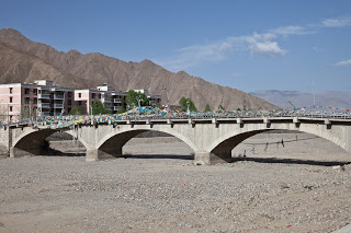 I was a bit early for our appointed meeting time so I decided to take a walk down to the river, a few blocks behind my hotel. Apparently my sea legs were now intact because I had no problem walking at a regular pace. The headache wasn’t going anywhere but that was no longer a deal breaker. The sky was blue, the sun was coming up over the mountains and I was on my way to enjoying my first day in Lhasa. I had to negotiate a closed bridge that at first seemed to be the end of my walk, but stepping over some construction debris I found myself on a cobblestone path that ran parallel to the river. Calling it a river though is misleading because unlike the river on the way it, this place had no water at all. It was a desert river from bank to bank – sand bars, stones, trash and nothing more. Up ahead a bridge colorfully be-decked with prayer flags –red for fire, yellow for earth, blue for sky, white for clouds and green for water according to the Tibetan beliefs – spanned the bed leading to a developed island in the center. I stopped here to make a call back to the US but getting an answering machine I picked up and headed back to the hotel where Tse Tan my guide and Mr. Sung my driver were waiting for me.