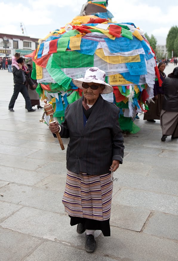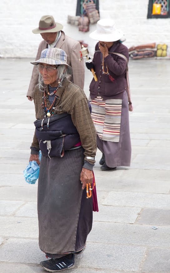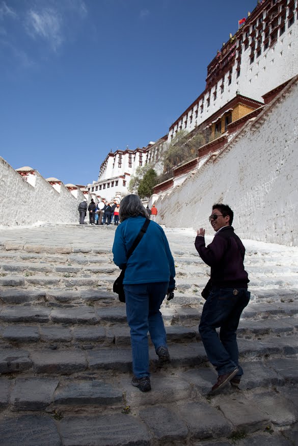 Our first stop today was the Potala for a tour. We drove the few blocks through light morning traffic passing countless pilgrims already up and making their circumambulations of the city. I asked where they came from and the answer was “all over the region.” The numbers ebb and flow depending on the weather and the Buddhist calendar, but in general there are always hundreds of them in the street. Most were elderly – this type of worship seems to be the province of people who no longer have to work. As we drove by, they walked on and on chatting among themselves and continuously spinning their prayer wheels.