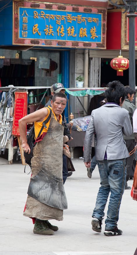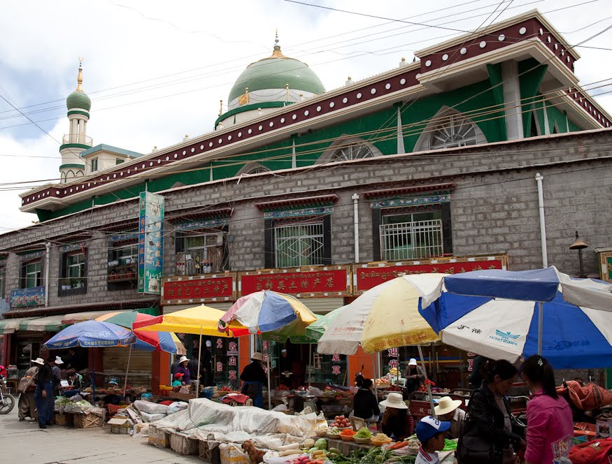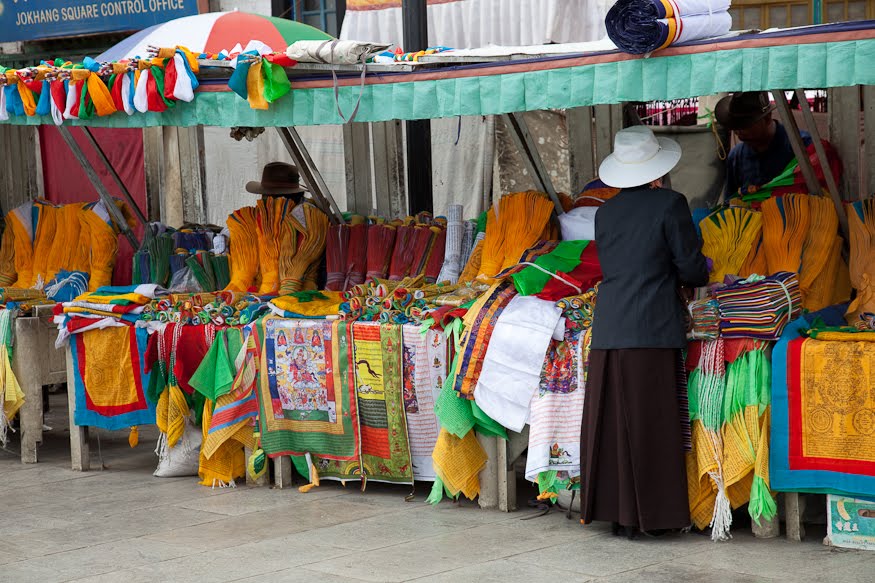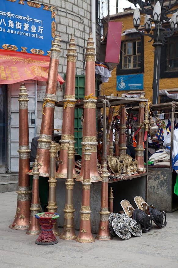 Like all the great cathedrals one leaves a place like this for the better, moved in many small and unexplainable ways. You feel good and you feel connected. We went back out into the sunshine and said “goodbye” having made our plans for the next day. I was close to the hotel so I went back and grabbed another handful of aspirin, unburdening myself from some of the things I had picked up over the course of the day. Leaving I took a different route back to the ancient town passing through the Muslim quarter, stopping to look at the outdoor butcher shops and the roof of the bright green mosque secure behind a tall white-plastered wall. I fell back into the flow of the pilgrims near the Jokhang and walked slowly looking at the goods in the stalls. Prayer wheels, Buddha, long Tibetan temple horns, running shoes and t-shirts – everything you could imagine.