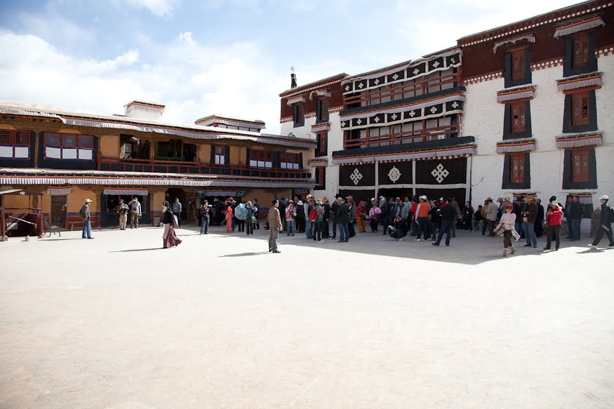 The drive was so short that a walk might have been a better idea. We said goodbye to Mr. Sung and rounded the corner through the same pile of construction junk I had stumbled over the night before when my brain and feet were not properly connected. Today the palace was resplendent – what a difference a shining sky blue back drop and a bright sun can make. As we headed towards the entrance Tse Tan explained that we had to be in line by a certain time and that the line was likely to be very, very long. He was right about the length – he told me to get in the end of it and he disappeared, returning in 5 minutes and telling me to follow him. He took me to the front and introduced me to a colleague whose name was Tse Dashi who said “hello” and opened his hand, asking me to sample some tiny brown cubes that the two of them were chewing on. He explained that they were pieces of some sort of barley pancake. I’m ever cautious, but I’m also aware of my responsibilities as an exalted guest, or actually an exalted paying customer. I picked a few out of the pile and popped them in my mouth. They were hard, dry, and crunchy and vaguely grain flavored. I thanked him and he didn’t offer me seconds. Tse Tan then folded me into a group of 6 westerners explaining that “the people who run this place like us to combine smaller tours into one big one.” Tse Dashi disappeared and Tse Tan took us inside. At first my new companions seemed a bit put off, and I suppose I was too having paid dearly for a “tour of one”. But faced with hours waiting to get in I wasn’t complaining – I started making small talk to diffuse their reluctance and soon we were getting along just fine.