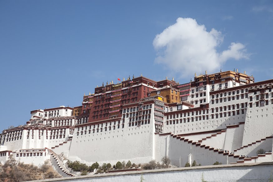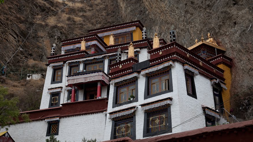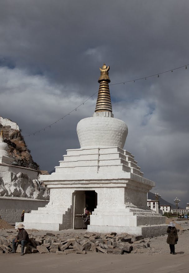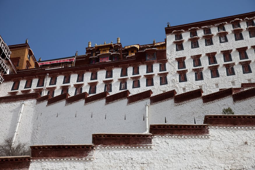 No pictures are allowed inside, so I had to plan to leave with only my memories. The Red Palace has served as the quarters of the Dalai Lama from the earliest days of this building. The tour route wound a confusing serpentine from room to room, sometimes crossing where we’d been and other times forming a series of concentric circles. We walked through the private rooms where the Dalai Lama had lived and met with visiting dignitaries and through broad, dimly lit assembly rooms where the learned would debate the nuances of their beliefs. In one room two incredibly ornate and detailed giant gold mandalas stood behind wooden screens, depicting the notion of eternal recurrence and the wheel of life. All along the way worshipers were spooning Yak butter into fonts that held small burning candles, offerings to the various Buddha in the room. It was all very moving and quite different than anything I had seen in any of the other temples I’d visited across the country. The colors reminded me a lot of Mexico and Central America – bright ochre walls trimmed in vivid red and turquoise. Tse Tan kept his patter up but each time we stopped a security guard would move us along.