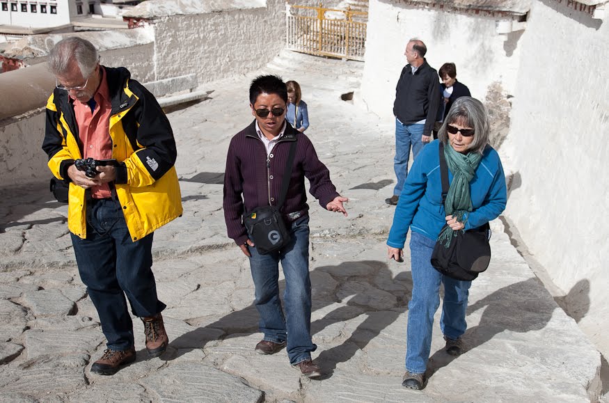 A few more twists and turns and we were back out in the sunshine on a platform overlooking the city. Tse Tan pointed to the smoky haze and told us that it wasn’t pollution, rather the product of the devoted burning juniper branches as an offering. Somehow I’d managed to lose the rest of the entourage and ended up walking and chatting with Ina, the only tour member that had ended up with me. At the bottom of the ramp I handed her a business card to give to William and I bid her farewell. We headed back to the car, the Potala behind us.