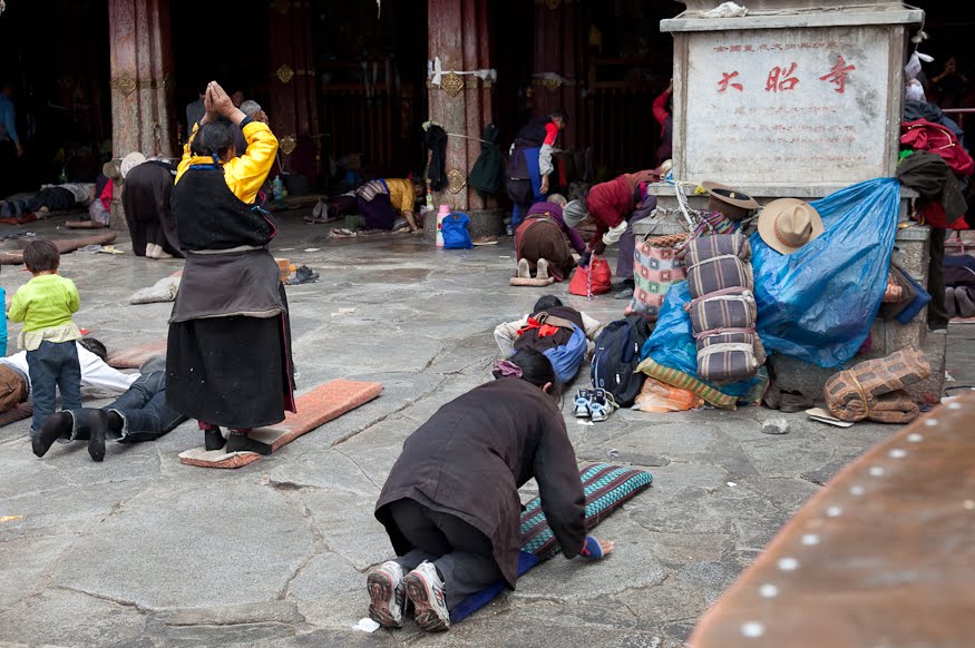 The line of pilgrims here extended for many yards out the front door, but the Tibetan Guide Mafia came into play once again. Tse Tan ran into yet another colleague who handed him a partially used ticket which he have to me. A “souvenir” as he called it. The crowd he explained was unusually large today as this was the weekend preceding the entrance exams to the better Chinese secondary schools and so there were a lot of students and parents here to pray for good results. We cut to the inside of the line and went into the main atrium, Yak hair sunshades blowing in the breeze and golden roofs decorated the surrounding buildings. In entering we passed many women and children praying in a side yard, standing, kneeling, lying prostrate and repeating the process in a seemingly endless cycle.