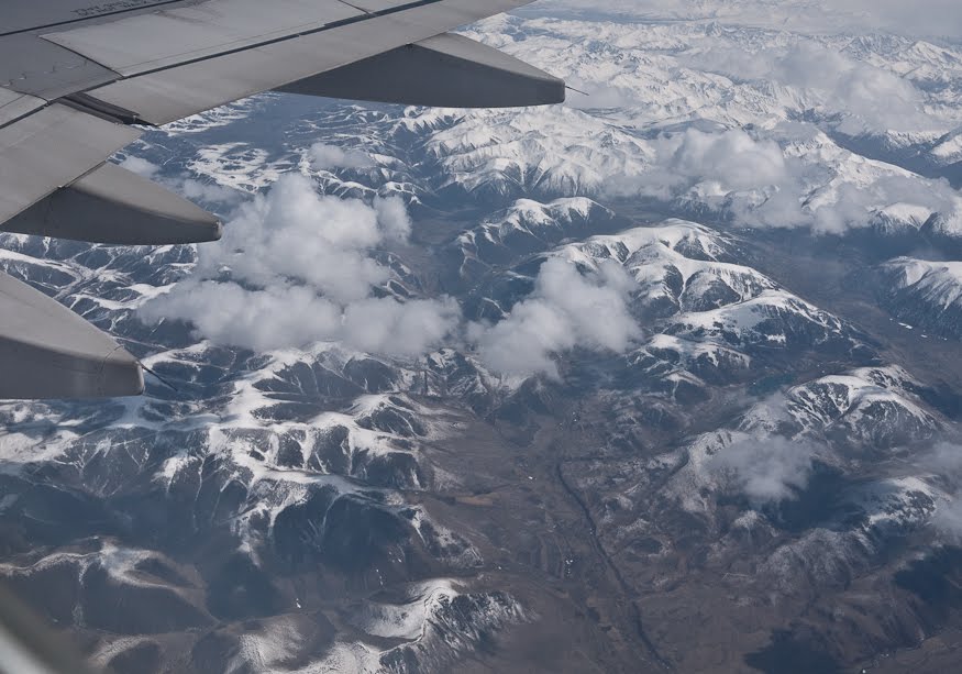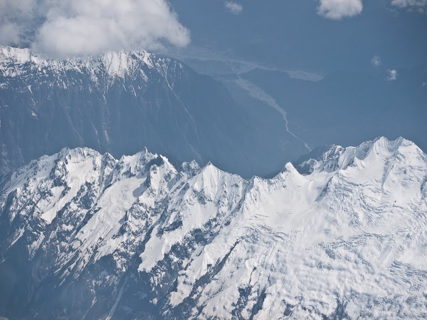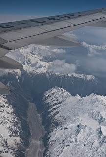 On the way in I’d rued the fact that I didn’t have a window seat, the view of the Himalayas was breathtaking. Today I had one and I felt truly privileged to be seeing the world below. Craggy snow capped peaks and deep, black valleys. Occasionally I’d see a tiny town with buildings with blue roofs along a plunging river. We crossed a huge dirty gray glacier plowing its way down hill. As a whole the emotion of seeing that entire wilderness left me beyond words. I sat and took pictures and mused about the fact that I’d seen these mountains, Mt. Fuji, the Sierras and the Rockies in only one month’s time.