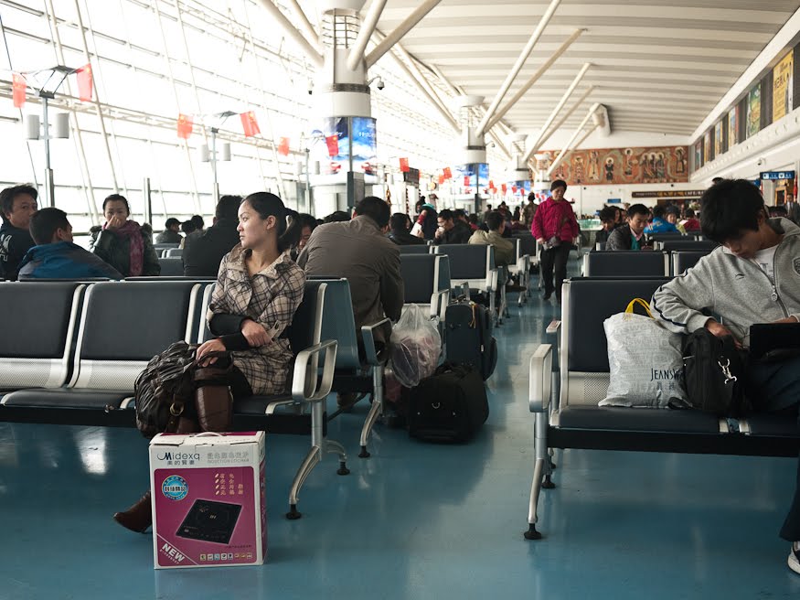 As we approached Chengdu the snow began to disappear from the mountains save one last 24,000’ peak off in the distance. We were now in the land of the four rivers, “Sichuan” as it’s known in a direct translation. I was working the math and looking at my list of flights and it looked like I had a decent chance at the 7PM departure which would put me in Beijing at 9:30, too late to head to Dalian but at least only an hour away. Of course adding to my excitement we landed on some extremely remote section of the tarmac and took a ridiculously long bus ride in to the terminal past all the empty, unused jet ways. I made my way back upstairs to the ticket counter and after being told to head to the Late Arrivals desk I had my options – I could go standby at 6 or get a seat at 7; I chose the latter feeling that the standby rush would kill me while buying me nothing. The agent told me to come back at 5:30 for a boarding pass and I went outside to reserve a hotel room with my iPhone.