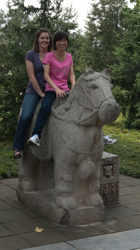 Two stone horses stand at the far end of the park and it’s become a tradition to get a photo of my guests sitting on them. Gwynn climbed up and told me to make sure that I cut her feet out of the photo lest the position be wrong and observed by my horse-riding loved ones back in the world. I took a shot and as she was climbing down a young Chinese man accompanied by his girlfriend smiled and began a pantomime that suggested that they wanted to use the horse. We were done so I waved him on. But I had misinterpreted his request – he wanted a photo of Gwynn on the horse along with his girlfriend. She climbed back up and I joked that I wanted 10 kuai for the photo. He looked at me for a second and then realized the joke.