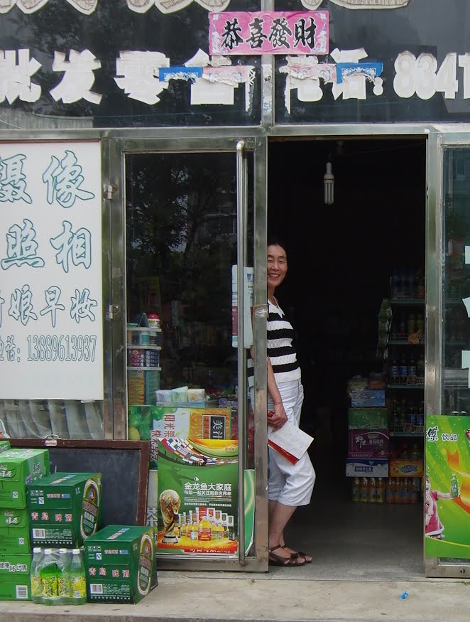 The woman who owns this store seems to be in her mid-40’s to perhaps early 50’s but it’s difficult to tell – all of the rural Chinese lead hardscrabble lives and I think it ages them prematurely. She is taller than most of the Chinese women I know and has sort of a wistful sadness about her, as though she had dreamed of something else but had ended up here in this shop on this small town street. She’s pretty and she cares about herself, taking the time to pencil in her black eyebrows and to do her hair. She loves to talk and ask us questions and Dermot obliges while I just try. On this visit I saw a little cluster of brown and blue bruises on her arm in the shape of a hand and as though she’d been roughly grabbed. No idea but I suspect it was probably a case of drunken husband, a common problem in these parts where people are poor and being left behind by the progress that others enjoy in the big cities and the resentment just builds, only partially assuaged by beer, cigarettes and arguments.