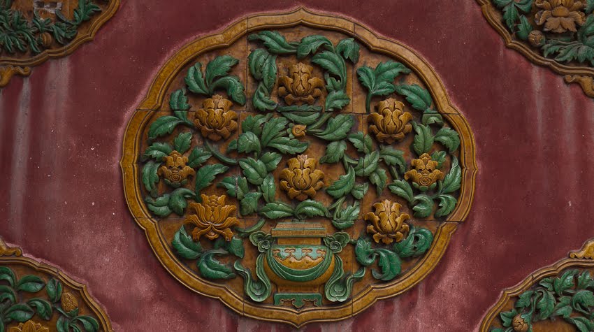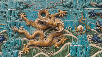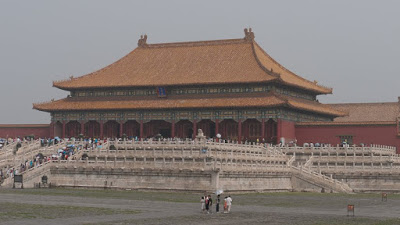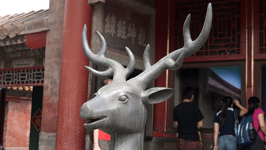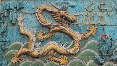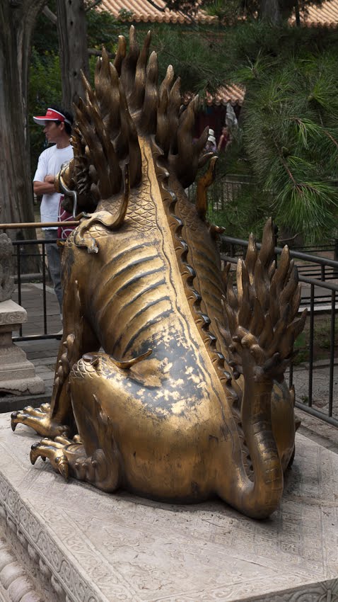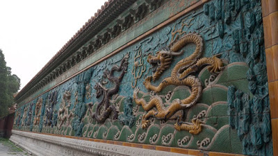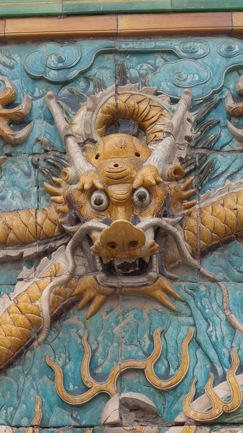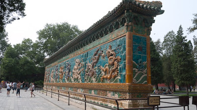 My second objective was the Nine Dragon Screen that Gywnn and I had chosen to forego on our visit in May. Today I found it after making a fool of myself by asking the ticket taker at the Hall of Treasure where it stood in plain sight about 30 yards beyond where I was standing. He laughed when he pointed. It turns out that there are three such screens in China and I had just seen the best preserved version on my trip to Datong. Prior to reading the sign in front of this one, I thought that there were two. Lo and behold the third was right across the street in Beihai Park, my afternoon destination. My quest was thus extended. These screens are quite remarkable constructed of glazed ceramic tile and formerly serving as the protection (from evil spirits) barrier at the door of some imperial personage. This one was quite beautiful built in 1756 and well preserved.
