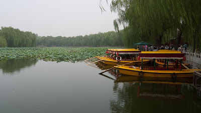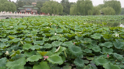 I followed a path around the Lotus pond hoping to find a sign leading to the Beihai version of the Nine Dragon Screen but finding none decided to give up my quest and find a place in the shade to rest a bit before heading out to the subway. I figured I would see it in the future on some trip when it was not so hot. Remarkably I found a bench under a towering willow tree which I immediately grabbed. I sat there as a grandfather held his young grandson up in the air so that he could pee on the tree.