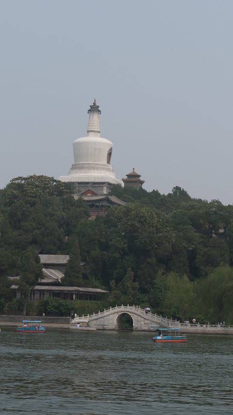 Eventually we found our way to the screen. I went about taking my pictures and she made me take a couple of her; we were apparently now on closer terms because she handed me her purse to hold each time. The Beihai screen was quite beautiful, nicer than the one I’d seen earlier but not quite as nice as the one in Datong despite having two sides (or 18 dragons.) Leaving there we walked along the lake, she staying mostly in the shade and under her umbrella. We talked about this and that. As we neared the exit, she asked a young girl to take our picture with the lake and the Dagoba in the background. She was closing in for the kill.