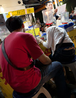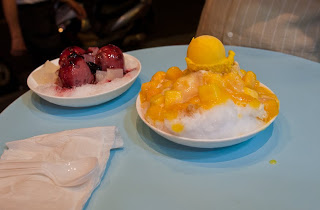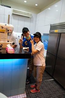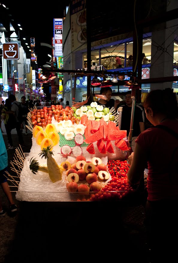 Like so many cities in the tropics, Taipei comes alive once the sun sets. While the evenings remain warm and moist, once the sun is off the back of your neck life on the street takes a decided upturn in quality. The city has a number of “night markets”, each with unique specialties and different degrees of urban sophistication. The one behind our restaurant was relatively small and not very busy and we strolled for about a block before Ben found what he was looking for, a true Taiwanese delicacy – mango shaved ice. Like every tradition in Asia this one had been mildly modernized – the stall was tiled, brightly lit, the workers had matching bright polo shirts and baseball caps and the menu offerings had catchy cold clime names like “blizzard” and “avalanche”. We decided on one plate of mango and one of mulberry and lychee. We grabbed a table on the sidewalk and pulled up three bar stools. The kids working in the back caught me taking their picture and cheerfully struck the traditional Chinese photo pose – smiling and throwing a “V” sign. Our food arrived, a big pile of fresh fruit and syrup sitting atop a mound of the finest and coldest shaved ice I had ever seen. It was like snow and it was delicious and such a great follow-up to our just completed steamed dinner.