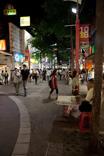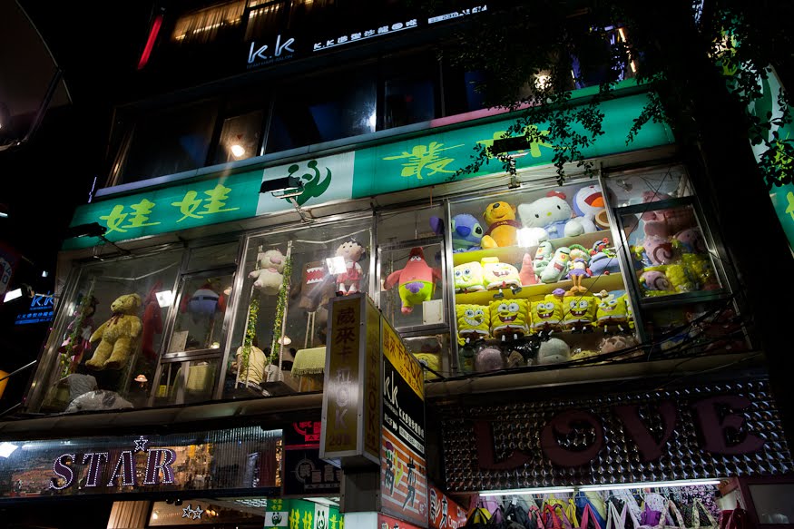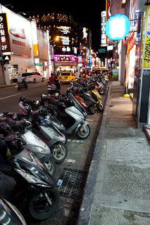 Another cab took us past the brightly lit Presidential Palace and off to Ximending Market, a modern version of the place we just left. For the first time in the trip we found ourselves mired in traffic – this place is very popular. The cabbie suggested that we hoof it for the last block so we paid up and hopped out; crossing a main intersection choked with dozens of the now ubiquitous scooters. Ximending turned out to be much like pedestrian walking districts everywhere the world from Santa Monica to Grafton Street in Dublin, but with an incredible vitality. The lights and the designs were like nothing I’d seen, a giant golden head atop a curry restaurant, a café crammed from floor to ceiling with giant stuffed animals, a huge rotating wheel of anime sushi that announced a second floor restaurant and laser designs dancing on the sidewalks, emanating from somewhere up above. Hundreds of teenagers moved in flocks, still in their school uniforms catching a quick meal while gossiping with their friends and checking out the opposite sex. Tattoo parlors spilled out into the path and fresh fruit vendors displayed their colorful ware in the middle of the broader lanes. A bright orange shop labeled “Condom World” was surprisingly empty. The anchor for the place was the newly restored Grand Concert Hall built in the early 1900’s, all brick and nicely illuminated with soft white spots, imparting a stately elegance. We wandered up and down a few streets taking in the sights and smells; I stopped for a chocolate donut figuring I it was an opportunity I wouldn’t have again – it was worth it. Another thing became apparent as we roamed around this place – the Taiwanese are very friendly. They make eye contact, they smile and they’re happy to talk – none of the feeling of invisibility you get wandering around where we live. It was very refreshing.