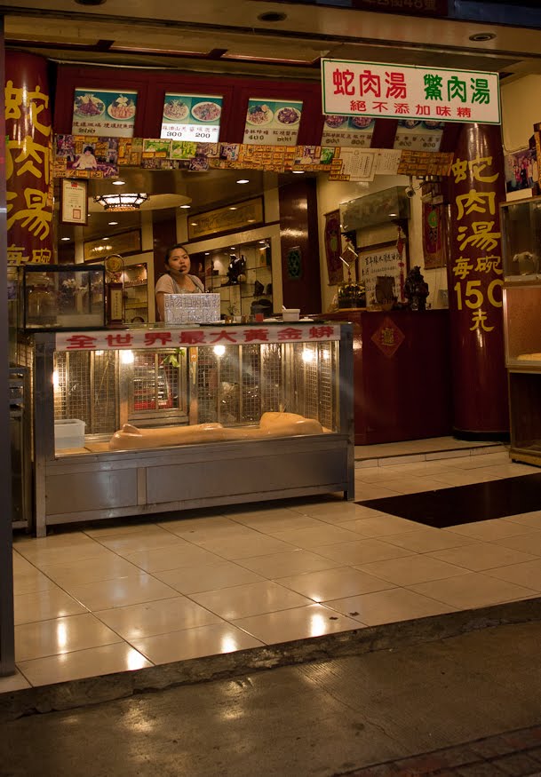 The process is simple. Some gal whose guy is suffering from a lack of resolve takes him by the hand and leads him to the Alley where together they purchase a snake. The poor animal is prepared by the chef, the gall bladder is removed and the bile is extracted and drunk by the man. Then the couple enjoys a nice snack of stir-fried snake meat and tea and they go home, presumably, to a night of reptilian passion. No idea if it works – no one wanted to be interviewed. The places were interesting though and I did manage to sneak one clandestine photo of a woman who claimed to have the world’s largest Burmese Python. Whether he was on the menu or just an attraction, I don’t know. I might be worried that devouring his gall bladder might result in one of those “greater than 4 hours” visits to the doctor.