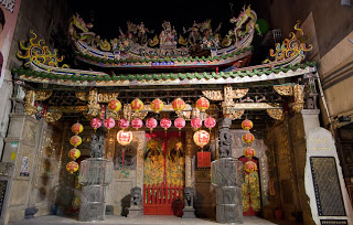 It was getting late and so after passing one last stand that was selling those same mouse-sized cockroaches as pets (I knew that beer loving fellow was not wild) we back out of the market and into some silent streets where we surprisingly stumbled upon Qishan Temple. It was of course closed for the evening, but even so, there illuminated by only a few weak streetlights, I could see that it was very different than the temples I was used to. Far more ornate, baroque and a tiny bit scarier. Clearly the rendering of the dragons, phoenixes and other beasts were strongly influenced by the aesthetic of the southern mainland immigrants and not so much by the Ming and Manchu northerners. Completely different was the host of tiny people that roamed just below the eaves, depictions of various saints, demons and fairies. I looked forward to a daytime visit to one of these beauties.
