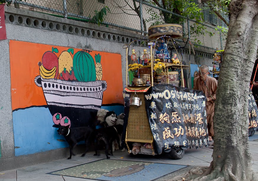 We stopped to look at the roof of another cultural relic, the Xinhui Academy, marveling once again at the intricate carvings. Down the street there was an interesting racket – some sort of Buddhist techno music and a host of barking dogs. Usually this means an outdoor street restaurant or some agglomeration of repairmen and vendors but what slowly presented itself was nothing of the sort. Eight Buddhist monks were approaching pushing carts, the lead of which had five happy barking dogs tethered to the front. Up top – spinning prayer wheels, burning incense globes and shrines with tiny Buddhas. Each cart was covered with a black cloth with gold writing in Chinese characters. We stood staring and wondering if we were really seeing this procession as it approached and passed. Ben translated and the message was “our purpose is to provide safety and comfort for the abandoned street animals, dogs and cats. And by the way, we buy houses.” A mobile animal rescue and real estate temple.