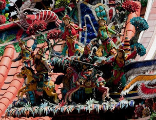 As I’d mentioned previously, Taiwanese temples were an incredibly different feast for the eyes. Adorned with dragons and birds and tiny people they were far more ornate than those I have visited. Most of the structures in the city were built in the early Qing Dynasty (1st through 3rd decade of the 1700’s) by the thousands of Fujianese immigrants who came to the island during that period. Where most temple architecture I’ve seen has been brightly painted and heavily carved, Longshan took both of those arts to a completely new level. Every ten foot long dragon was made of thousands of individually carved and painted spikes of wood, creating a most unusual and prickly design. The roof tiles and eaves were equally as bright and made busier by all those tiny saints riding horses, taming animals and fighting battles. It was hard to decide where to look first, and it was clear that you could spend an entire day just photographing details. Inside the main gate, the front courtyard had a big waterfall off to the right side which helped a bit with the heat, which was now starting to become quite oppressive. It also added a pleasant sound to the surroundings. We entered the second gate and went into the inner courtyard.