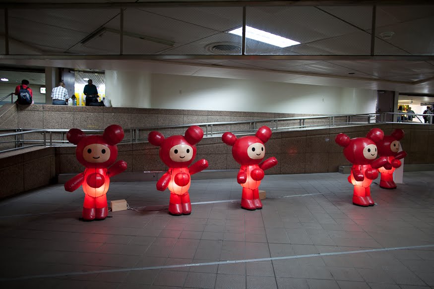 The station was on the far side of the municipal complex, not far but the walk was oppressive due to the heat and the humidity. And it was only 8:30; I was glad for my sunscreen. Traveling down the escalator though helped instantly with the heat. We had a long walk down a cool marble corridor just as welcoming as the one we used at the airport to enter Taiwan. The floors were clean, the lighting pleasant and the walls were lined with art and tasteful advertising. We bought day passes knowing that we would be riding all over town, entered through the turnstiles and went downstairs to an equally neat, lit and clean platform where we caught a train with the same remarkable conditions.