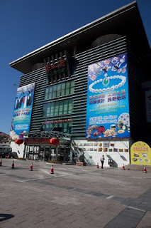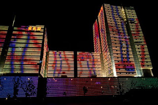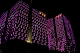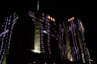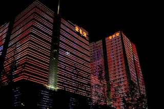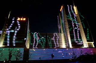 I spent a few hours in the lounge planning my next steps; when you’re alone and not a party animal the evenings sometimes require some thinking. I like the lounge because I can have snacks for dinner and I don’t need to go hunting and gathering for a restaurant alone. Many nights this year have been spent at this one particular table, eating chicken wings and tempura yams, staring out the window, drinking white wine, listening to their Brazil-techno music and chit-chatting with the girls who work the desk. From this vantage in the evening, there is a building on the eastern horizon that is a veritable psychedelic lightshow once 8 PM rolls around – crazy colors and patterns that go on and on until perhaps 10 PM. I’ve sat there alone, with both of my kids and multiple co-workers discussing the place and wondering what it was. Entertainment district? Shopping mall? Tonight I decided it was time to find out. I asked one of the girls if she knew and told her I was going to walk there. I got the answer I expected – when it comes to walking in this country, the reply is always “Oh that’s too far.” Walking is something for countryside peasants, not gentile city dwellers. I grabbed my bag and my camera took a good look at the route and headed out the door.