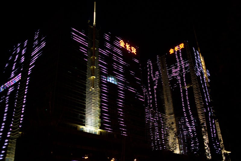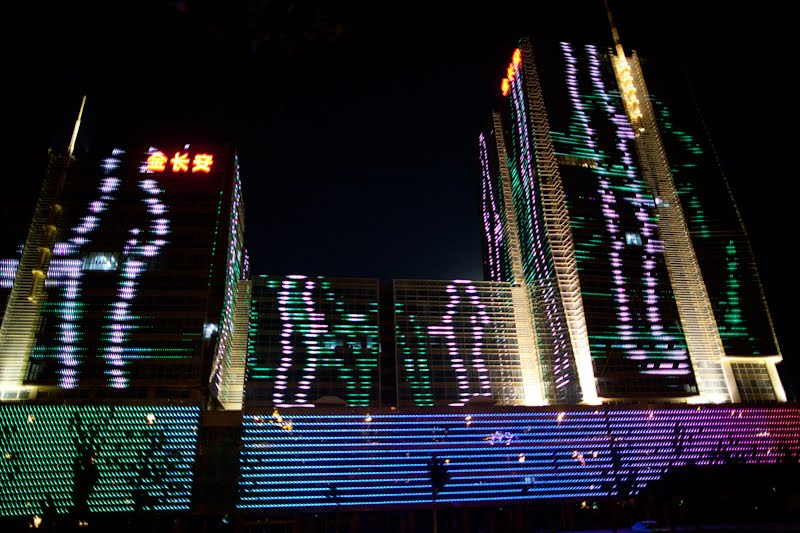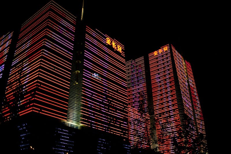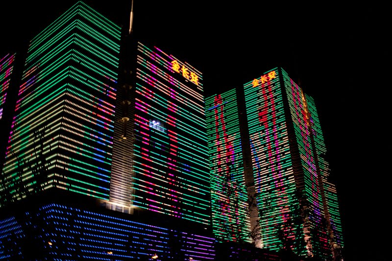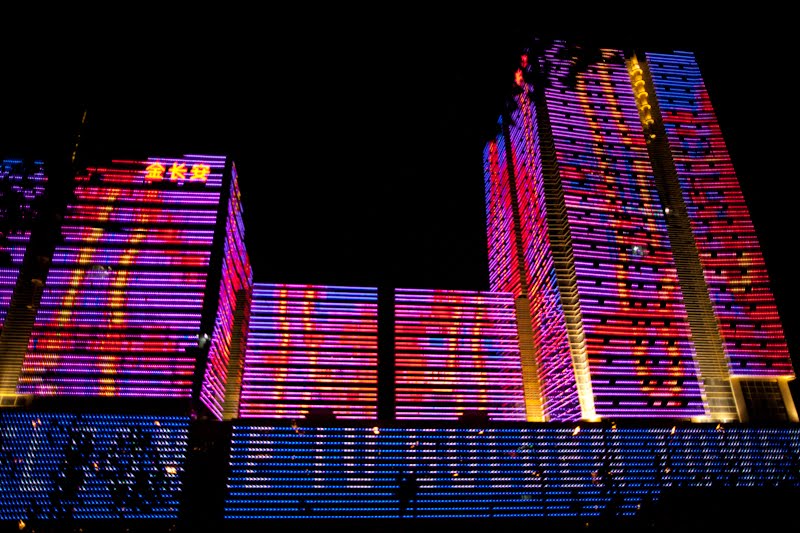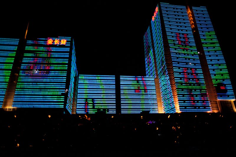 I spent a few hours in the lounge planning my next steps; when you’re alone and not a party animal the evenings sometimes require some thinking. I like the lounge because I can have snacks for dinner and I don’t need to go hunting and gathering for a restaurant alone. Many nights this year have been spent at this one particular table, eating chicken wings and tempura yams, staring out the window, drinking white wine, listening to their Brazil-techno music and chit-chatting with the girls who work the desk. From this vantage in the evening, there is a building on the eastern horizon that is a veritable psychedelic lightshow once 8 PM rolls around – crazy colors and patterns that go on and on until perhaps 10 PM. I’ve sat there alone, with both of my kids and multiple co-workers discussing the place and wondering what it was. Entertainment district? Shopping mall? Tonight I decided it was time to find out. I asked one of the girls if she knew and told her I was going to walk there. I got the answer I expected – when it comes to walking in this country, the reply is always “Oh that’s too far.” Walking is something for countryside peasants, not gentile city dwellers. I grabbed my bag and my camera took a good look at the route and headed out the door.