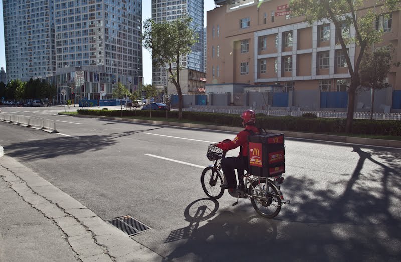 After a coffee at Starbucks I took a leisurely late afternoon walk back to the hotel. The holiday had largely cleared the streets and the setting sun created nice, golden patterns on the side of the skyscrapers I was passing. I saw the world’s loneliest McDonalds deliveryman riding his moped down the wrong side of the street, having dropped his goods at one of the tall buildings where someone must have been unfortunate enough to be working. It was a glorious afternoon – blue sky, warm temperatures and no crowds – about all you can ask for in this city.
