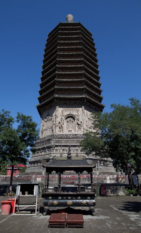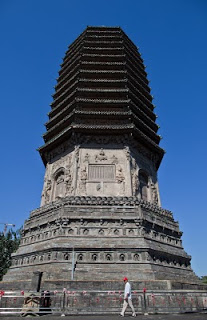 Built between 1100 and 1120 AD at the end of the Liao Dynasty, Tianning is truly a thing of beauty. Unlike the wooden pagodas throughout China that it mimics, this structure is completely solid and so was never used to house artifacts as its inspirations were. 3500 bells still hang from the tip of every eave and during a strong wind the place is said to be musical. On this day it was a bit breezy, but not enough to get the bells moving. A Buddhist nunnery stands at the back of the compound and saffron robed nuns were coming and going carrying food to some midday repast in one of the courtyard buildings. Out of respect I did three passes around the structure meditating on how I came to be at this place walking among people doing the same thing, although most of them must have been on their hundredth circuit by the time I joined in. I spent the rest of my time trying for the perfect picture, waiting for a while at one point while some Frenchman tried for the same shot. He stopped to talk and told me that he had been here once before a few years earlier but found it closed. He said he was happy it was open today and I agreed.