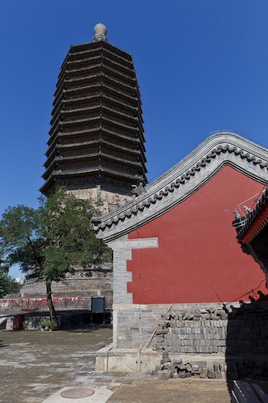 Tianning Pagoda was next on the agenda and the path there was not particularly clear. There are a lot of major roads in Beijing that get in the way of walkers, often making it very hard to get to the other side. I could tell from the map that this was going to be one of those situations, with a Ring Road in between me and where I wanted to be. The map showed a couple of ways under it, but information like that really doesn’t mean much here – maps are little more than suggestions and the roads are laid out to serve drivers, not walkers. Walking east, I purposely overshot the place where I thought the pagoda might be, walking through some nice simple neighborhoods while looking for a right turn in order to head south. I found one that looked promising and sure enough I could see the top stories of the pagoda rising high about the freeways, looking at once marvelous, dingy and completely out of place. Next to it rose a much taller and far less interesting smoke stack, the perfect companion here in a country that doesn’t seem to be able to get anything right.