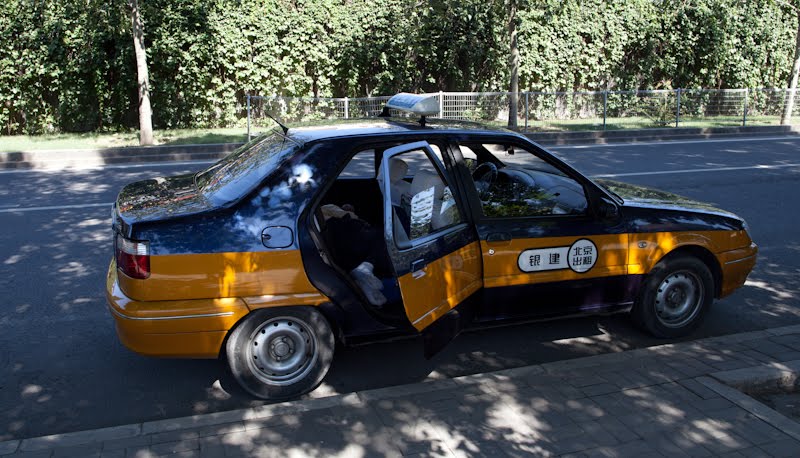 I have been to a few places that really pained me to leave, and this was one of them. But there remained things to do so I left and retraced my steps back towards the subway station. It was now midday and things were changing in the streets. I passed a long line of parked taxis, each with a driver stretched out and sleeping on the back seat, waiting for the lunchtime break at some factory. I walked past some sort of government gentlemen’s club (judging from the Mao over the front door). Inside a long line of beautiful young women stood shoulder to shoulder chatting, each dressed in identical yellow and pink cheongsam waiting for some functionary to arrive. It was a long walk back to the subway (isn’t it always longer heading back?) but I made good time, caught the next train and rode it to Wangfujing Station for a bite of lunch.